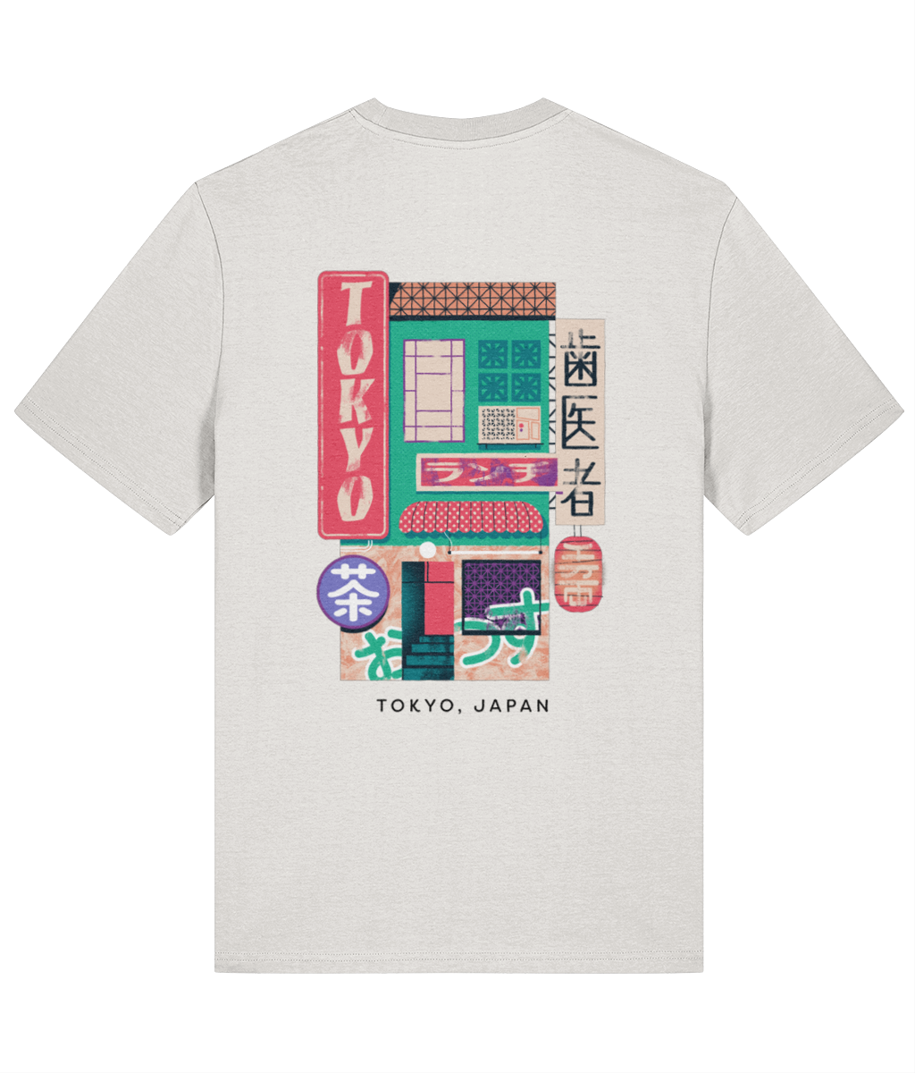 The Tokyo tee takes on the face-paced city energy of Tokyo's streets. Made from 100% organic cotton in vintage white, this women’s crew neck t-shirt features our signature embroidered logo on the front and a vibrant print on the back inspired by the vibrant streets and creative pulse of Tokyo.